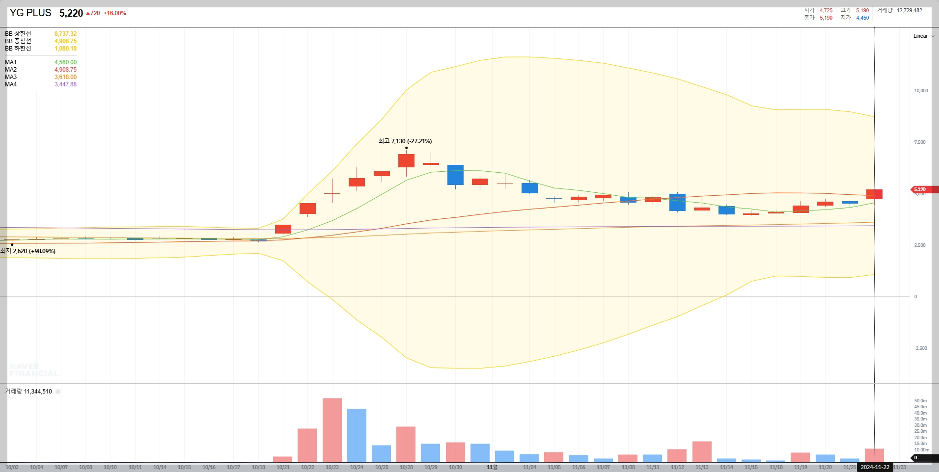 2024년 11월 기준 YG PLUS의 현재 주가는 5,220원으로 최근 몇 달간 급격한 상승세를 보였습니다. 특히 지난 한 달 동안 16% 이상 상승하며 투자자들의 관심을 끌고 있습니다.